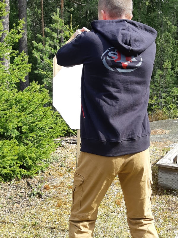 College huppari STI-logolla. Molemmin sivuin vetoketjulliset taskut.